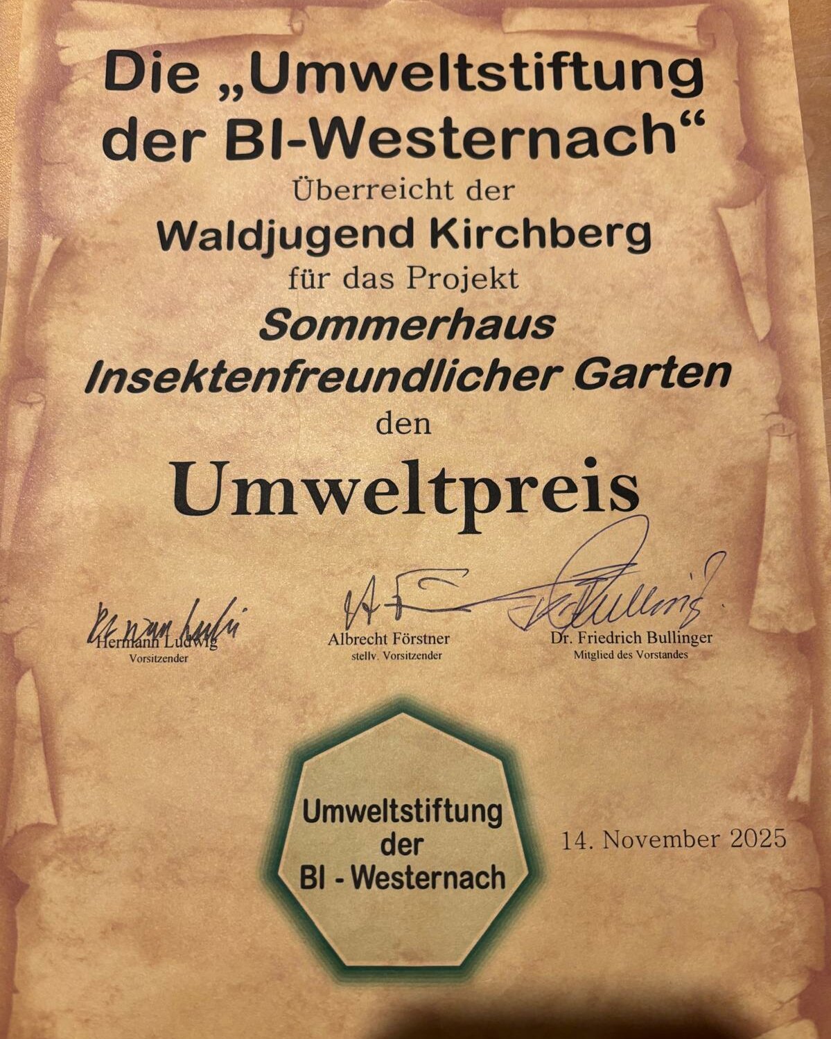 Die"Umweltstiftung der Bürgerinitiative (BI) Westernach" ist eine Stiftung, die den jährlichen Umweltpreis für besonders engagierte Personen, Vereine, Firmen und öffentliche Einrichtungen in der Region Hohenlohe, Schwäbisch Hall und Crailsheim vergibt. Die Stiftung zeichnet Projekte in den Bereichen Umwelt- und Naturschutz aus und ist seit 30 Jahren aktiv